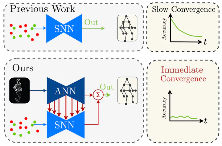 Spiking Neural Networks (SNNs) are a class of bioinspired neural networks that promise to bring low-power and low-latency inference to edge-devices through the use of asynchronous and sparse processing. However, being temporal models, SNNs depend heavily on expressive states to generate predictions on par with classical artificial neural networks (ANNs). These states converge only after long transient time periods, and quickly decay in the absence of input data, leading to higher latency, power consumption, and lower accuracy. In this work, we address this issue by initializing the state with an auxiliary ANN running at a low rate. The SNN then uses the state to generate predictions with high temporal resolution until the next initialization phase. Our hybrid ANN-SNN model thus combines the best of both worlds. It does not suffer from long state transients and state decay thanks to the ANN, and can generate predictions with high temporal resolution, low latency, and low power thanks to the SNN. We show for the task of eventbased 2D and 3D human pose estimation that our method consumes 88% less power with only a 4% decrease in performance compared to its fully ANN counterparts when run at the same inference rate. Moreover, when compared to SNNs, our method achieves a 74% lower error. This research thus provides a new understanding of how ANNs and SNNs can be used to maximize their respective benefits.
