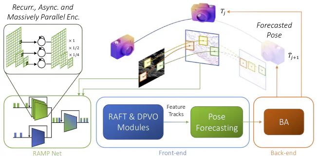 Visual Odometry (VO) is crucial for autonomous robotic navigation, especially in GPS-denied environments like planetar y terrains. To improve robustness, recent model-based VO systems have begun combining standard and event-based cameras. While event cameras excel in low-light and high-speed motion, standard cameras provide dense and easier-to-track features. However, the field of image- and event-based VO still predominantly relies on model-based methods and is yet to fully integrate recent image-only advancements leveraging end-to-end learning-based architectures. Seamlessly integrating the two modalities remains challenging due to their different nature, one asynchronous, the other not, limiting the potential for a more effective image- and event-based VO. We introduce RAMP-VO, the first end-to-end learned image- and eventbased VO system. It leverages novel Recurrent, Asynchronous, and Massively Parallel (RAMP) encoders capable of fusing asynchronous events with image data, providing 8× faster inference and 33% more accurate predictions than existing solutions. Despite being trained only in simulation, RAMP-VO outperforms previous methods on the newly introduced Apollo and Malapert datasets, and on existing benchmarks, where it improves image- and event-based methods by 58.8% and 30.6%, paving the way for robust and asynchronous VO in space.